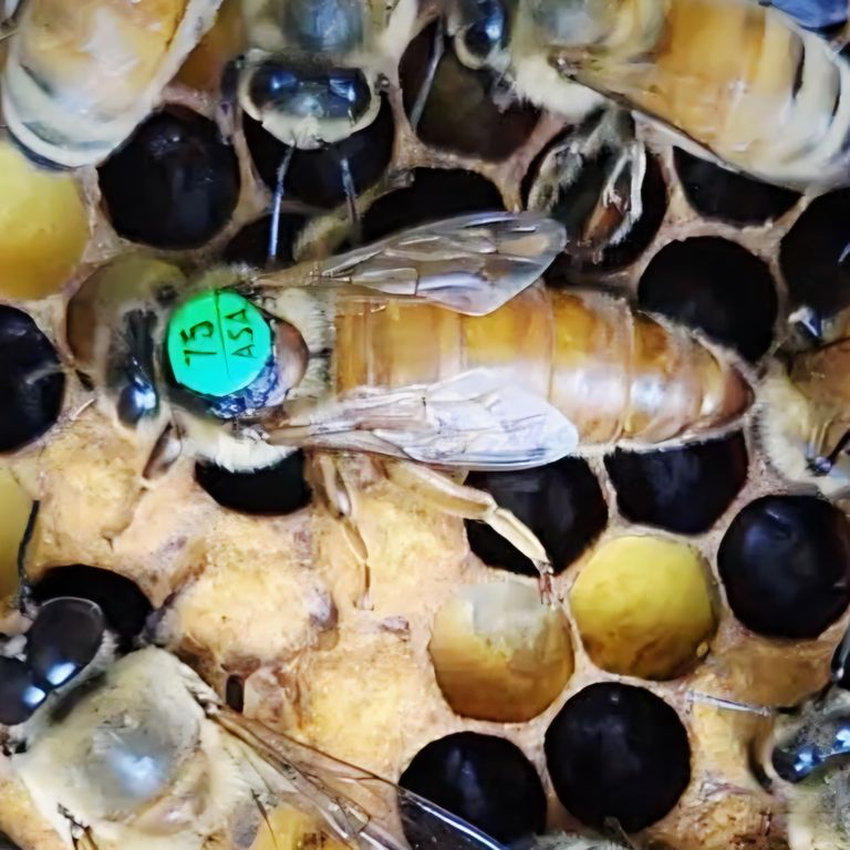 Die B75 hat in 2025 durchweg überzeugt. Die Angepaarung im Karwendel in 2024 mit der B23(SP) hat nochmals Stabilität in die Linie gebracht. Sicherlich hat Väterlicherseits die B601(TR) dazu beigetragen. Da die Mutter der B75, also die B42 sowie auch die B23(SP) in 2022 mit der selben Drohnenlinie in Leyhörn angepaart wurden. Sie geht bei entsprechender Betriebsweise sehr früh, bereits Mitte September aus der Brut und startet, zumindest in meiner Region, erst wieder Ende Januar. Trotzdem schafft sie es im April zur Frühtracht da zu sein und Ihre Leistung voll abzurufen. Eine sehr schwarmträge und wabenstete Biene, die einfach Spaß macht. In 2025 konnten Ihre Töchter ausgiebig getestet und bewertet werden. In der F1 Generation zeigt sich eine homogene Vererbung ihrer Eigenschaften mit gleichmäßigen Färbung.